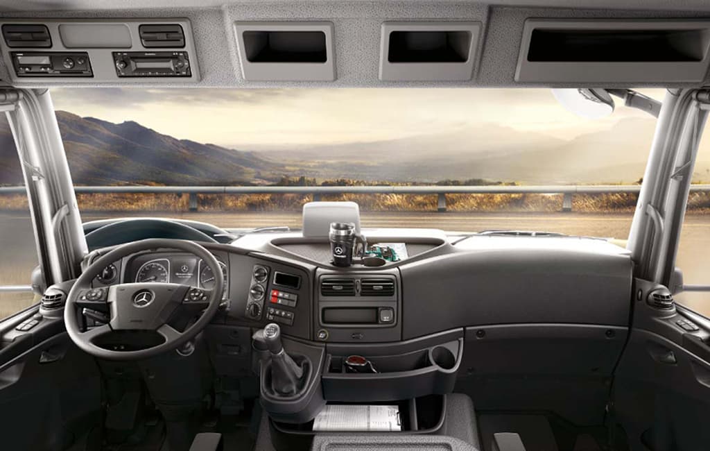 Subir al Atego 1726 es encontrar una cabina ordenada que facilita el trabajo desde el primer minuto. El volante multifunción y el Tempomat hacen la diferencia. Además, vas a poder gestionar las horas de conducción con mayor comodidad en un espacio pensado para el conductor profesional.